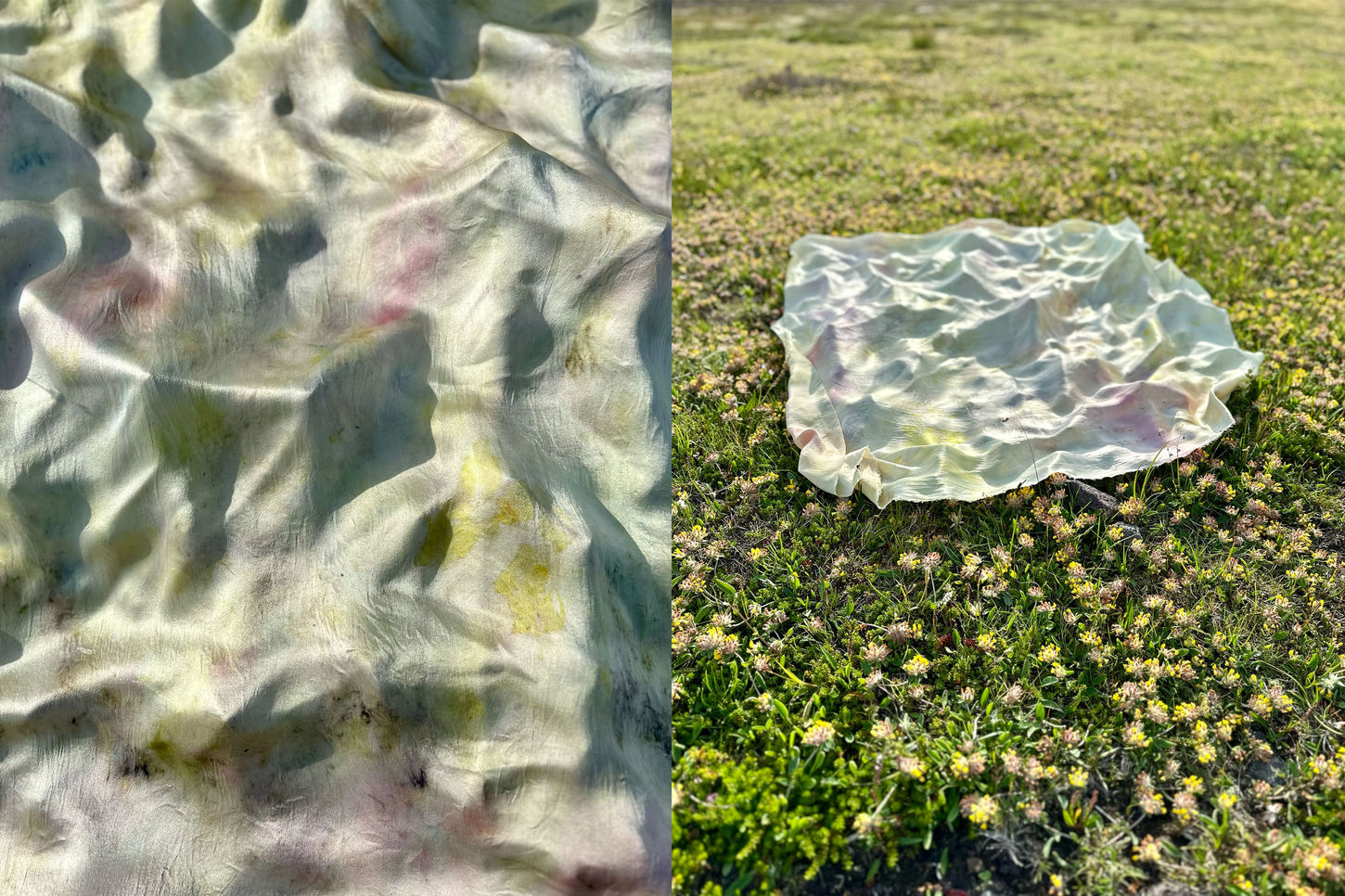 A collection of organic silks was hand dyed to create abstract, blurred prints of found materials, such as algae, moss, wood, soil and flowers. The silks produce a colour palette along the theme of regeneration in the age of the Anthropocene – a fingerprint of the place and specific time captured in the fibres, a colourful local cartography of Korpúlfsstaðir.